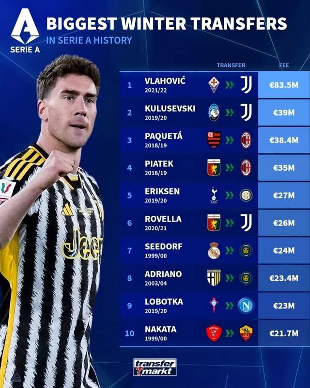 来到了冬季转会窗,各支权门在想考我方接下来的引入安排。其中,德国转会商场统计了意甲历史上冬窗最贵引援榜单,天然亚平宁向来是朴素过活的,不外也有几笔转会号称天价。