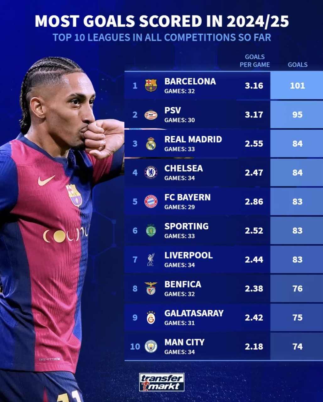 5、拜仁慕尼黑 83球 场均2.86球
