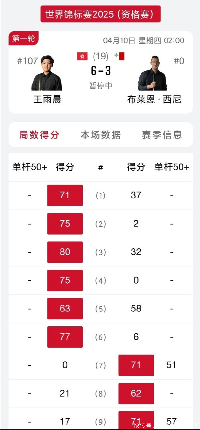 北京时刻4月10日凌晨,2025斯诺克世锦赛履历赛持续进行。第一轮的一场焦点比赛中体育集锦,中国香港选手王雨晨阐扬出色,他以总比分10-5支吾慑服布莱恩-西尼。由于下一轮的敌手、世锦赛冠军格雷姆-多特被禁赛,王雨晨如故晋级第三轮。