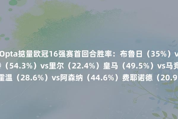 直播吧03月04日讯 数据机构Opta对欧冠16强赛首回合的比赛进行了输赢掂量,8场对阵中体育集锦,多特、皇马、阿森纳、国米、拜轻柔巴萨最被看好首回合取胜。 Opta掂量欧冠16强赛首回合胜率: 布鲁日(35%)vs维拉(38.6%) 多特(54.3%)vs里尔(22.4%) 皇马(49.5%)vs马竞(25.2%) 埃因霍温(28.6%)vs阿森纳(44.6%) 费耶诺德(20.9%)vs国米(56.1%) 拜仁(51.3%)vs勒沃库森(24.9%) 本菲卡(28.2%)vs巴萨(48.6