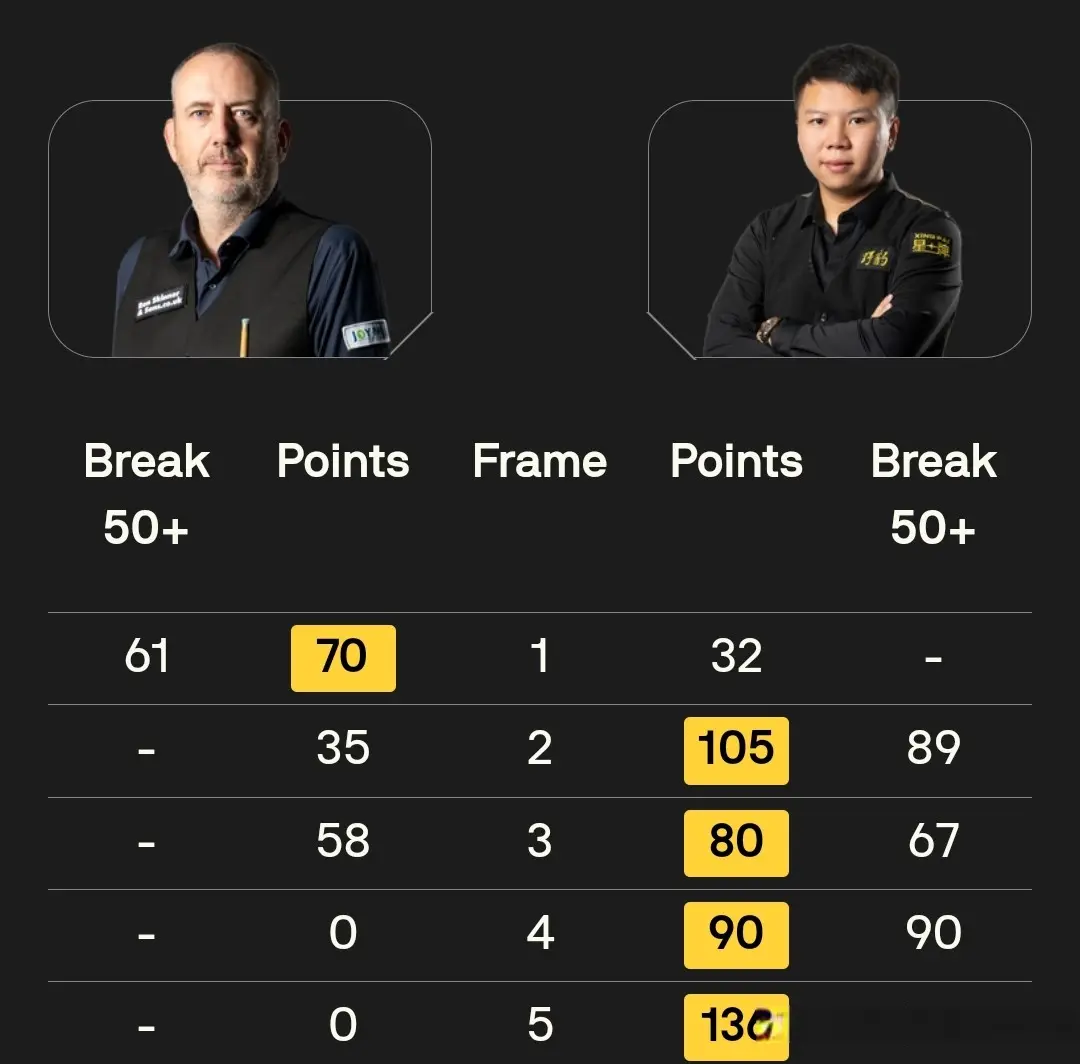 第五局,沃顿单杆打出56分以105:21拿下此局3-2反超肖国栋最初拿赛点。第六局,肖国栋单杆打出133分完成一杆制胜3-3战平沃顿。第七局,沃顿单杆打出71分拿下此局比赛的到手从而4-3绝杀肖国栋。而这亦然沃顿在两边近七次交手中获得的第二场到手。