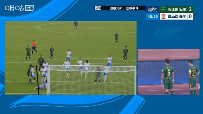 直播吧03月08日讯中超第1轮,浙江vs青岛西海岸。比赛第47分钟,米特里策前场纵情球罚出,朴镇燮落拓抽射被李昊扑了一下,球来到门前被刘浩帆哂纳破门。但VAR随后介入,主裁回看后认定刘浩帆手球,进球无效。